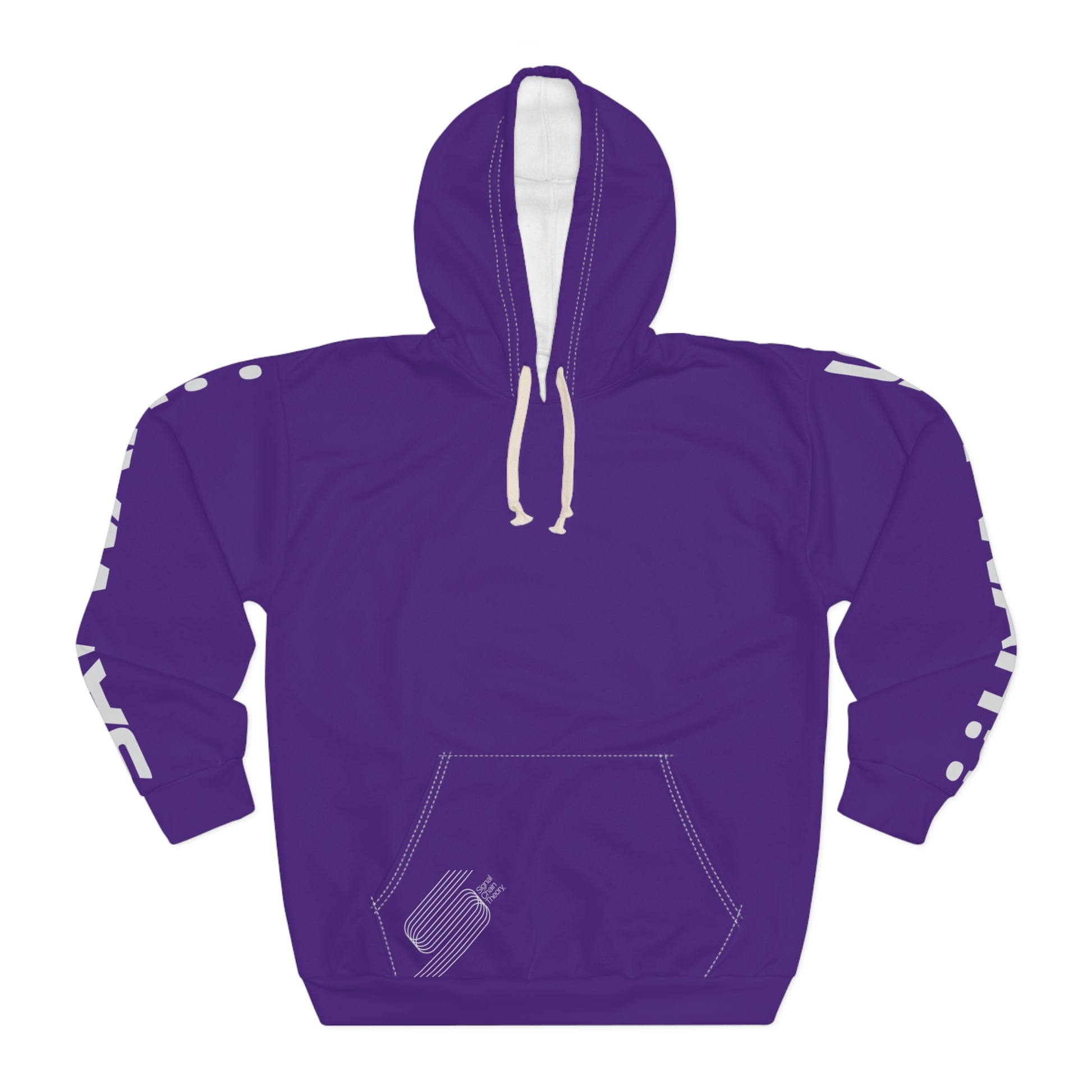 This all-over print pullover hoodie sings with bold color and playful attitude. Deep purple wraps the wearer in warmth while large white type across the back—SAY WAH?!—sparks curiosity and conversation. The back features a layered, semi-transparent diagram-style graphic that adds a nerdy, experimental edge. Sleeve text repeats the phrase for extra impact when you move. The roomy kangaroo pocket and adjustable drawstring hood make it a cozy layer for long nights out or casual studio sessions. It feels like a statement piece for people who blend humor and curiosity into their everyday look.